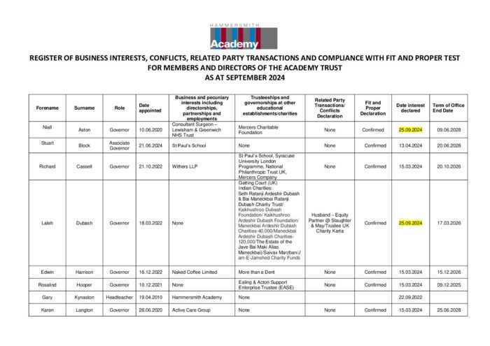 Register of Business Interests for Members Table 2024-25
