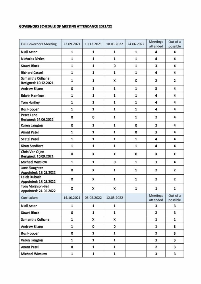 Governors Schedule of Meeting Attendance 2021-22