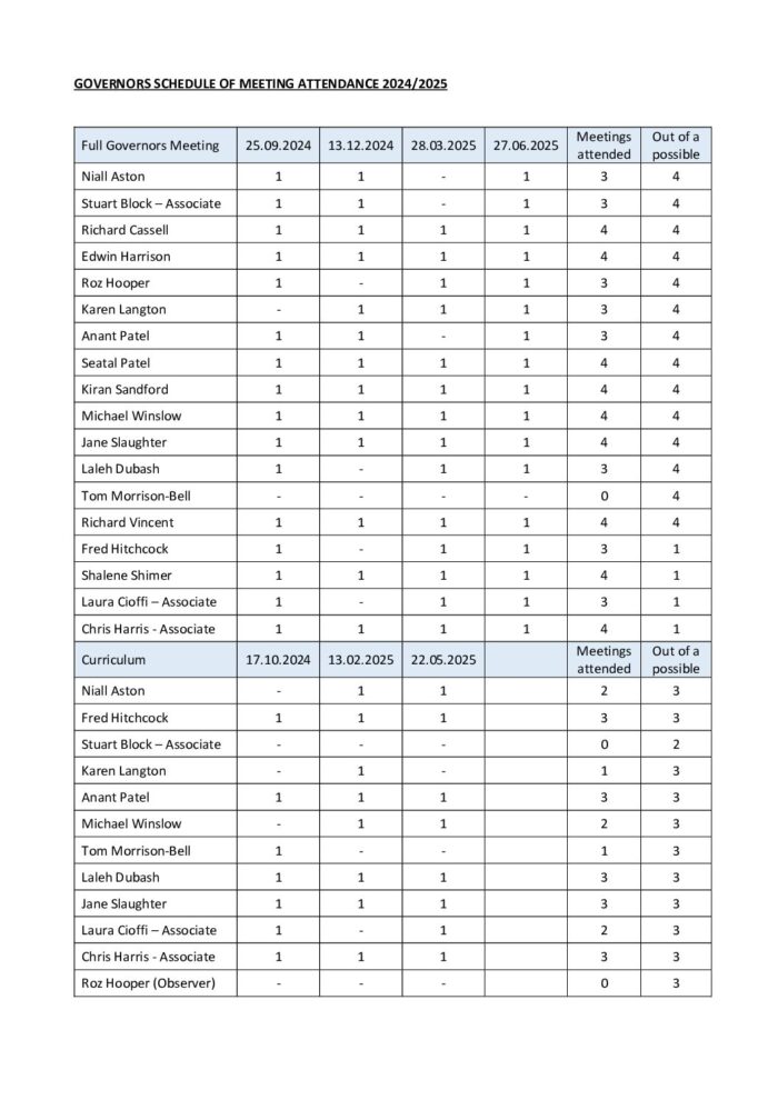 Governors Schedule of Meeting Attendance 2024-25
